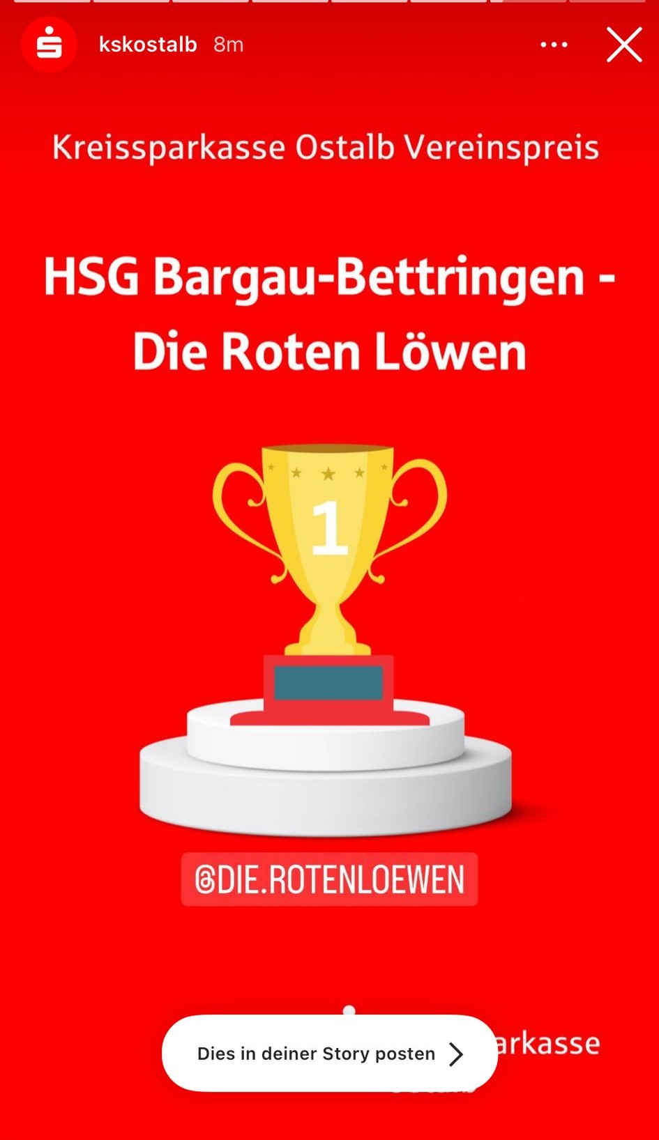 Die HSG Bargau-Bettringen bedankt sich bei der KREISSPARKASSE OSTALB für die Ausrufung des Wettbewerbes sowie bei allen, die für die ROTEN LÖWEN gestimmt und damit den Gewinn ermöglicht haben.