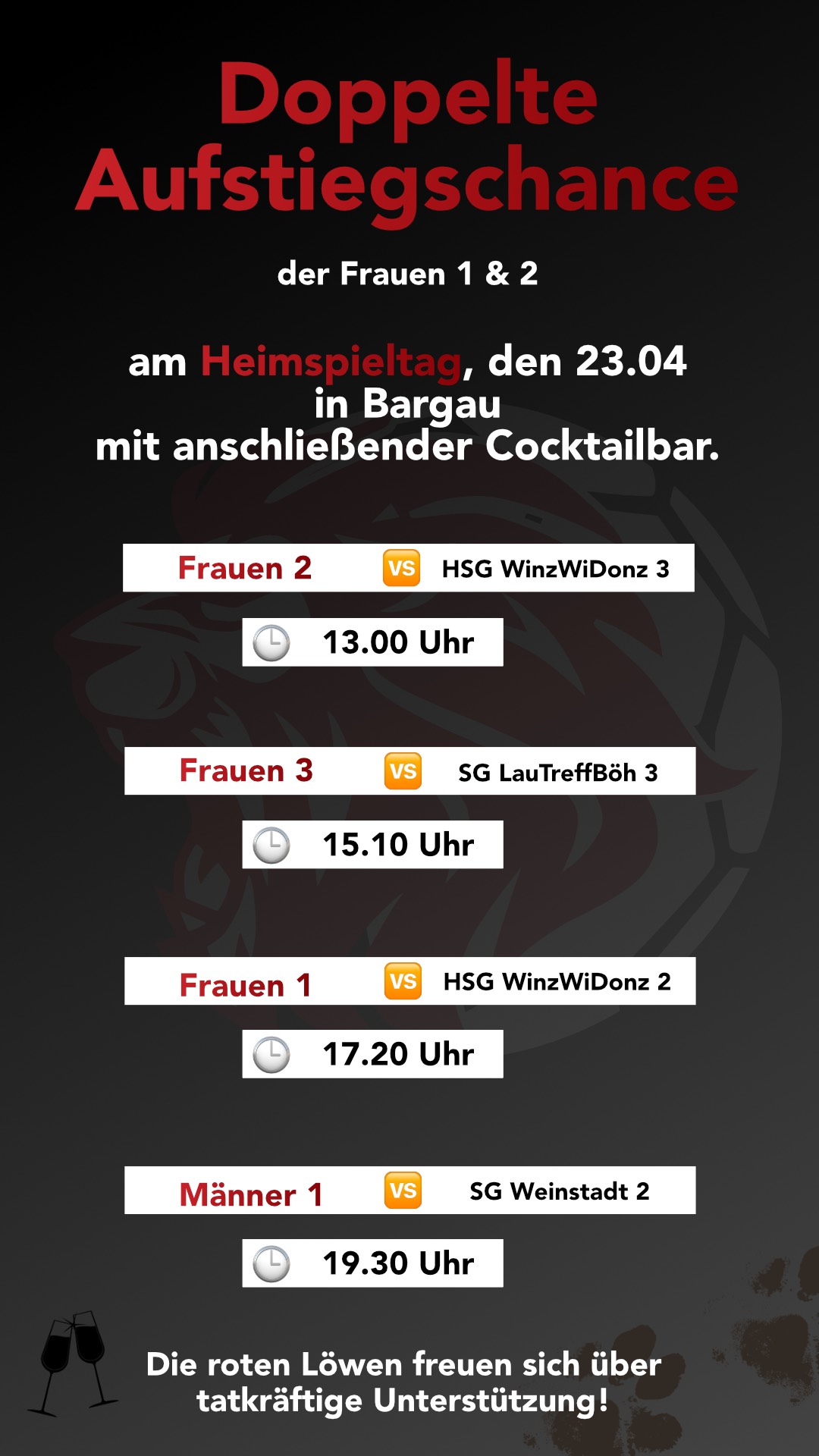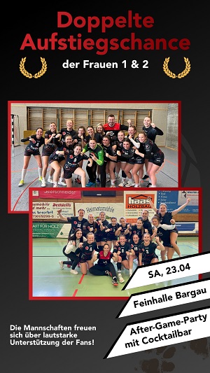 Unter der Voraussetzung, dass die Damen 1 + 2 jeweils siegreich bleiben, könnte ab cirka 18:45 Uhr die zweifache Meisterschafts- und Aufstiegsfeier in der FEIN-Halle beginnen !
