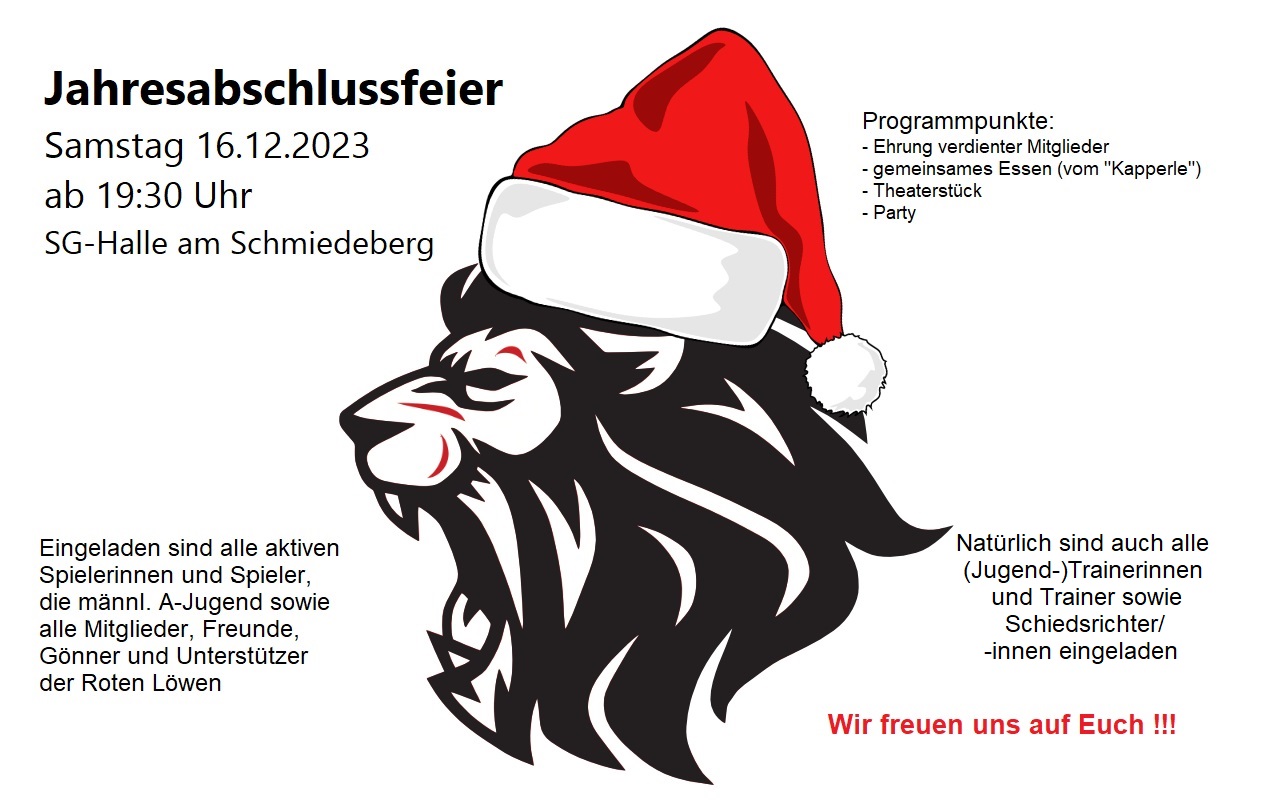 Einlass ab 19:00 Uhr, eingeladen sind alle aktiven Spielerinnen und Spieler, (Jugend-)Trainer/ -innen und Betreuer, unsere Schiedsrichter /-innen, die männl. A-Jugend sowie alle Mitglieder, Freunde, Gönner und Unterstützer der Roten Löwen.