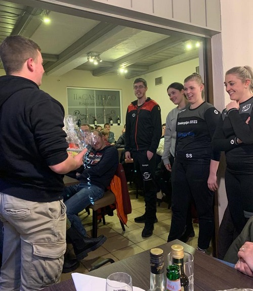 Obwohl das ausgegebene Ziel nicht erreicht wurde, war die Stimmung beim abschließenden gemeinschaftlichen Essen mit Eltern und Geschwistern doch wieder bestens. In diesem Rahmen wurden dann auch dem Trainerteam noch kleine Präsente zum Abschluss überreicht und auch Headcoach Kai fand in seiner kurzen Ansprache mit Rückblick auf das Geleistete nur lobende Worte.
