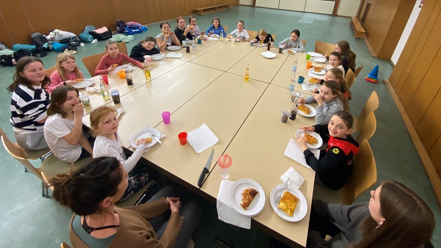 Am vergangenen Wochenende fand der Saisonabschluss der weiblichen E-Jugend statt. Hierfür hatte sich das Trainerteam einiges einfallen lassen. Die Mädels trafen sich am Freitag Abend in der SG-Halle. Nach dem gemeinsamen Pizzaessen wurde das Nachtlager aufgebaut. Anschließend gab es abwechslungsreiche Spiele. Absolutes Highlight war das eigens ausgedachte Rote-Löwen-Escape-Room-Spiel von Trainerin Laura. Durch gute Teamarbeit konnte am Ende der Schatz aus der gefundenen Schatzkiste verteilt werden. Erst in den frühen Morgenstunden vielen endlich bei allen die Augen zu.