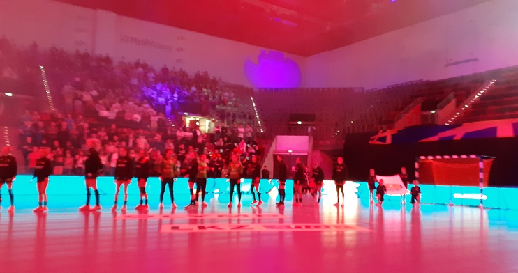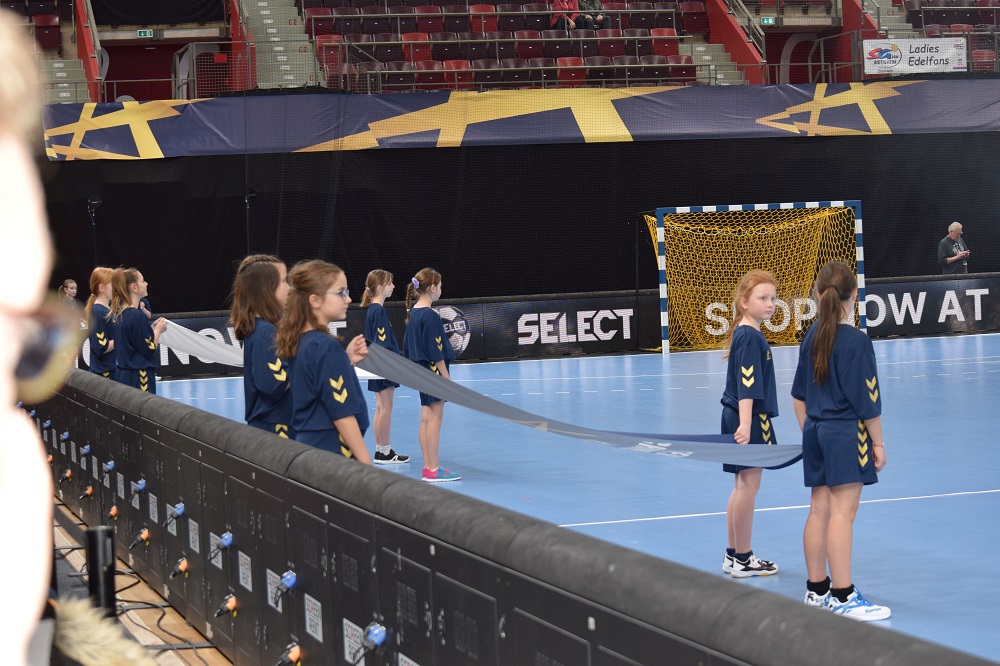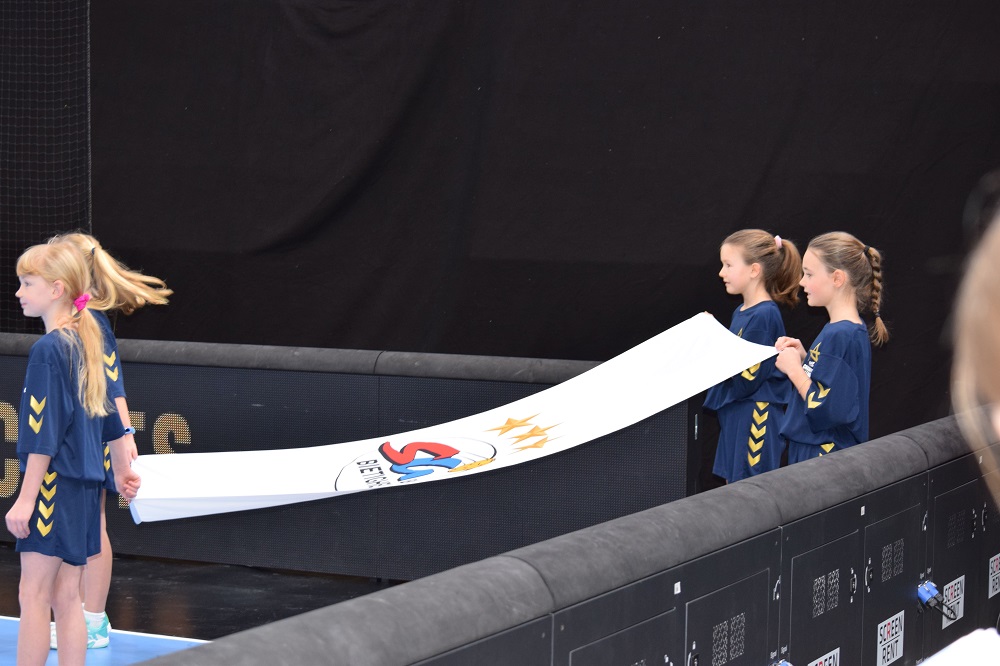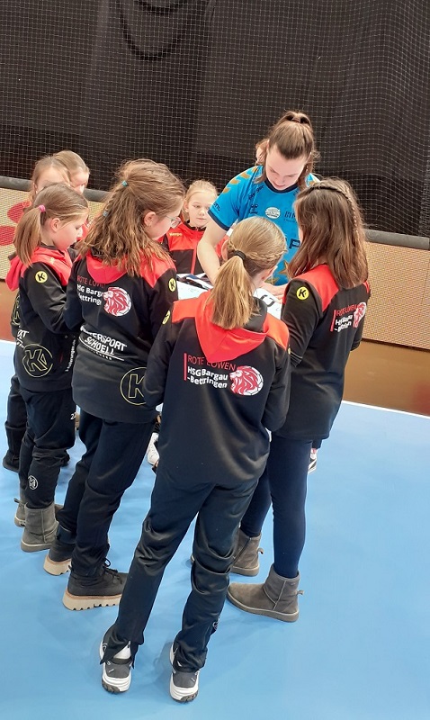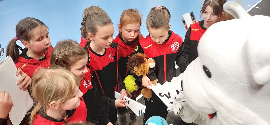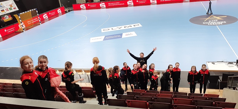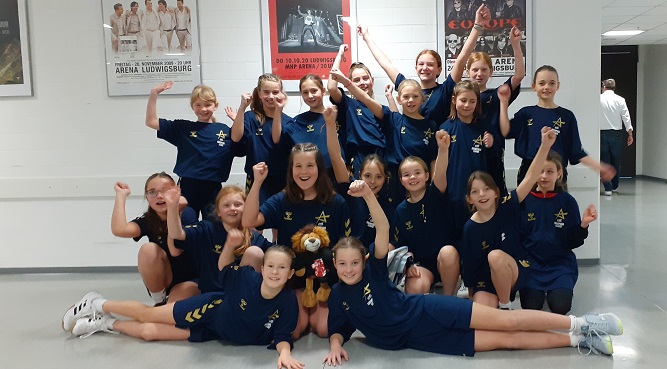 Am Sonntag vor einer Woche reiste die weibliche E-Jugend mit Eltern und Geschwistern (insgesamt 65 Personen) zum Champions League-Spiel der SG BBM Bietigheim gegen den tschechischen Vertreter DHK Banik Most. In der MHP-Arena vor knapp 1.700 Zuschauern durften 16 Junglöwinnen die Flaggen der beiden Vereine sowie der IHF Champions League auf das Spielfeld tragen, zwei weitere Löwinnen durften sich als „Wischer“ betätigen.