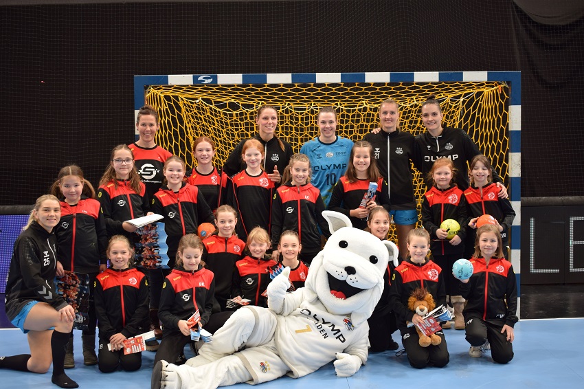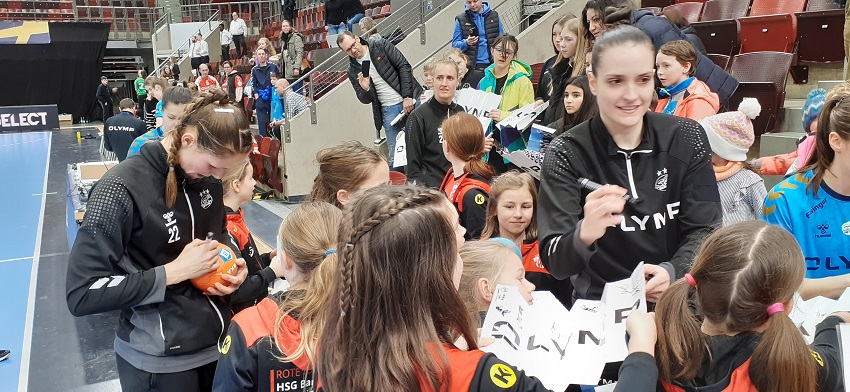 Kurze Zeit nach Spielende ging es dann auf Selfie- und Autogrammjagd. Völlig entspannt und geduldig stellten sich die Bietigheimer Spielerinnen, allen voran die deutsche Nationalspielerin und Kapitänin Xenia Smits zur Verfügung. Sie signierten nicht nur Autogrammkarten, sondern auch Bälle, T-Shirts und Schuhe und auch ein Gruppenfoto mit Smits, Torfrau Gabriela Moreschi, Inger Smits, Kelly Dulfer und der dänischen Nationalspielerin Trine Ostergaard Jensen kam noch zustande.