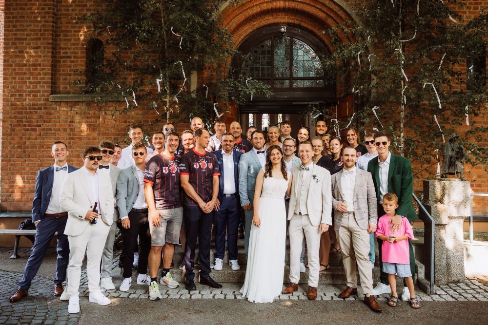 Zeugen der Zeremonie und Gäste bei der anschließenden Feier waren unter anderem natürlich viele Spielerinnen und Spieler der „Roten Löwen“, die sich noch an der Kirche zu einem gemeinsamen Gruppenfoto aufstellten.